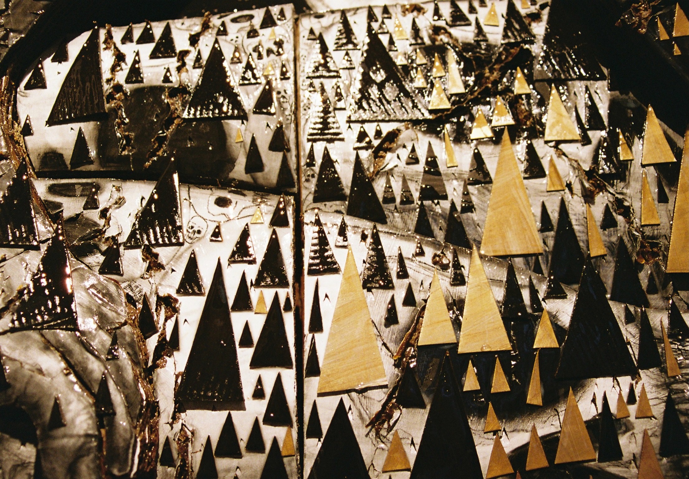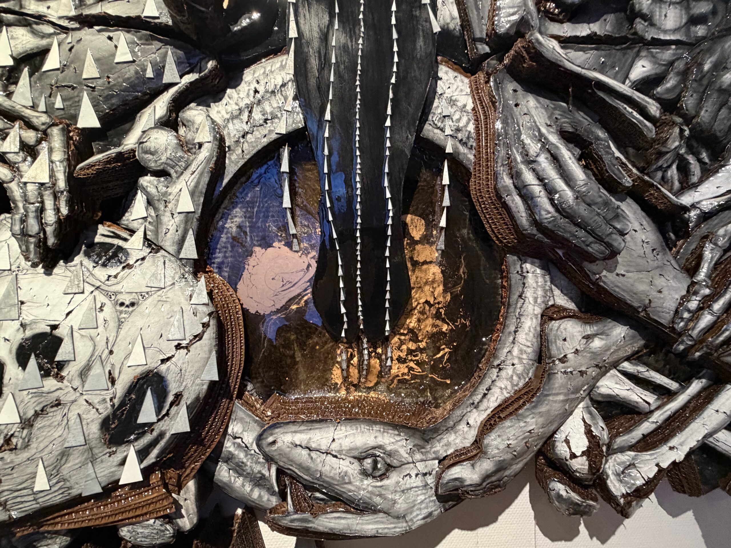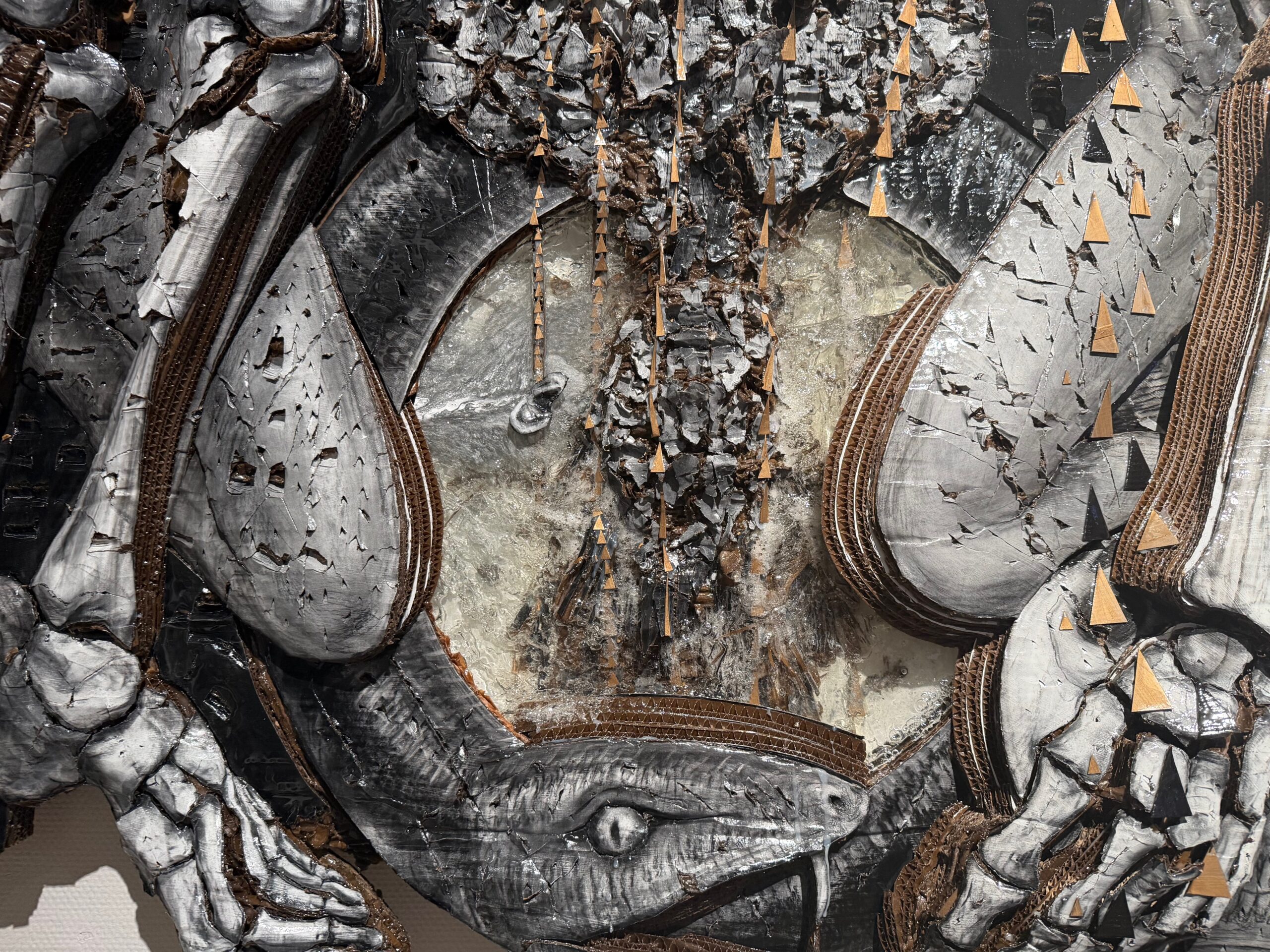 《死と再生のイニシエーション》が鑑賞者を圧倒するのは、さまざまな要素が挙げられるが、その一つは独自技法だろう。破損したダンボールの表面、浮き上がるように存在を示す神話的存在、精密に重ねられた三角形、樹脂の輝きをまとった作品群は、プロセスそのものが作家の生きざまを伝えるものとなった。