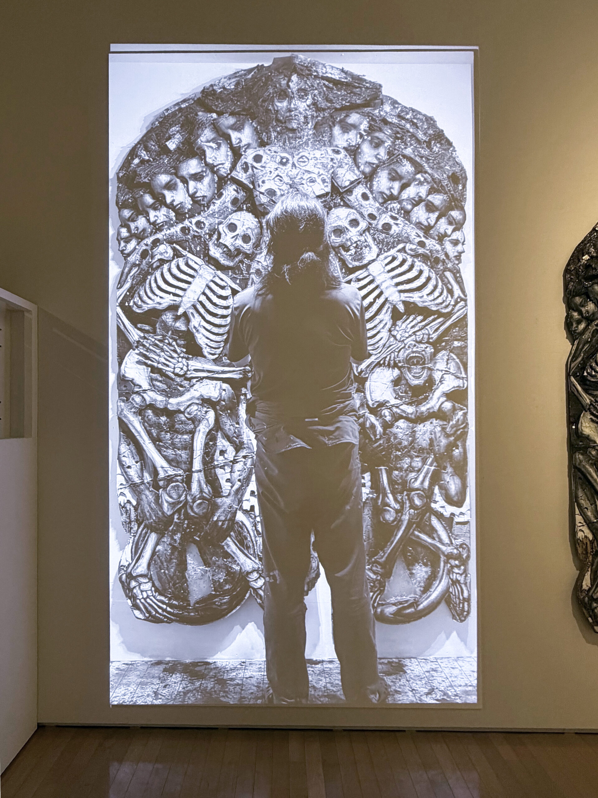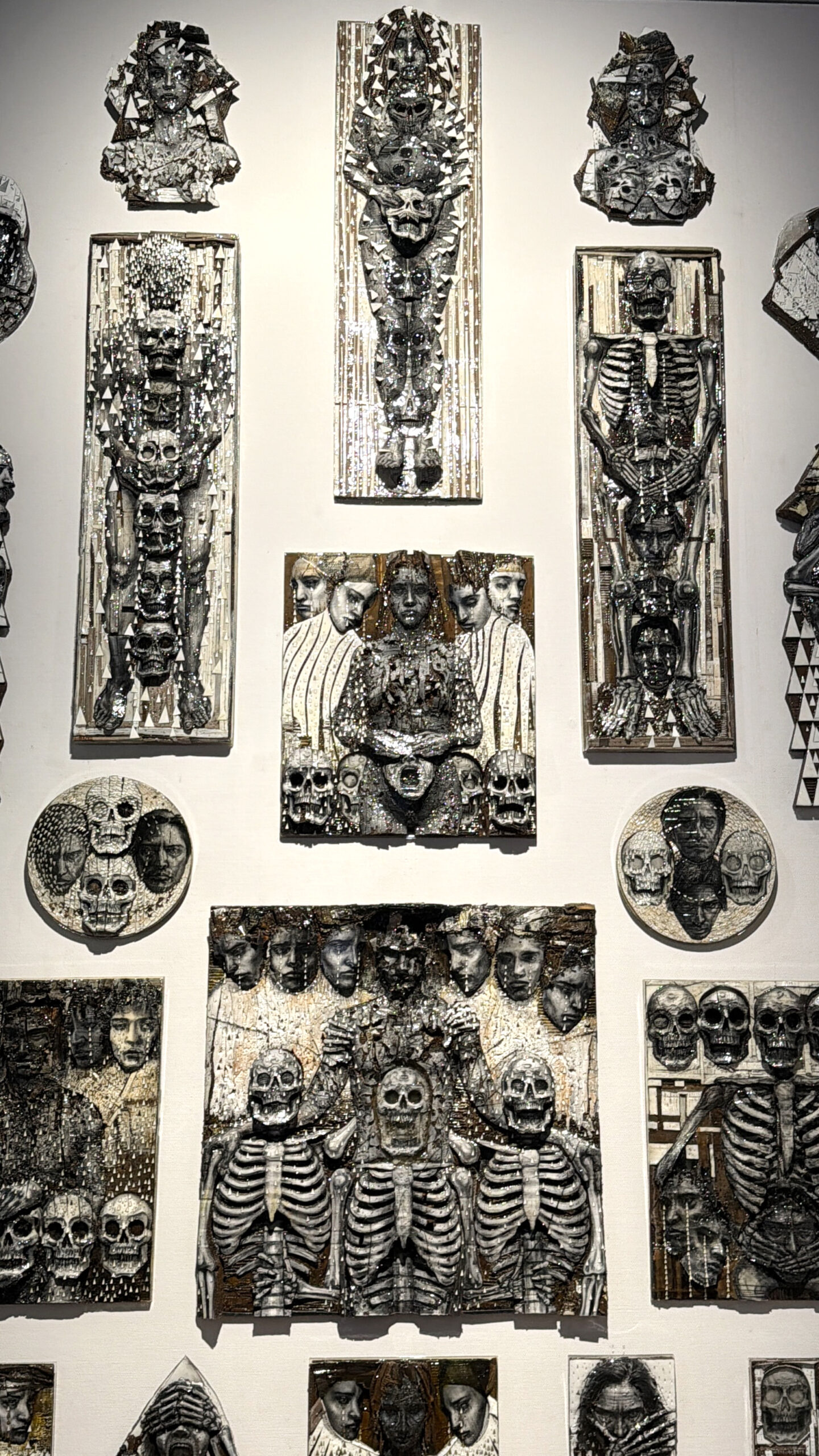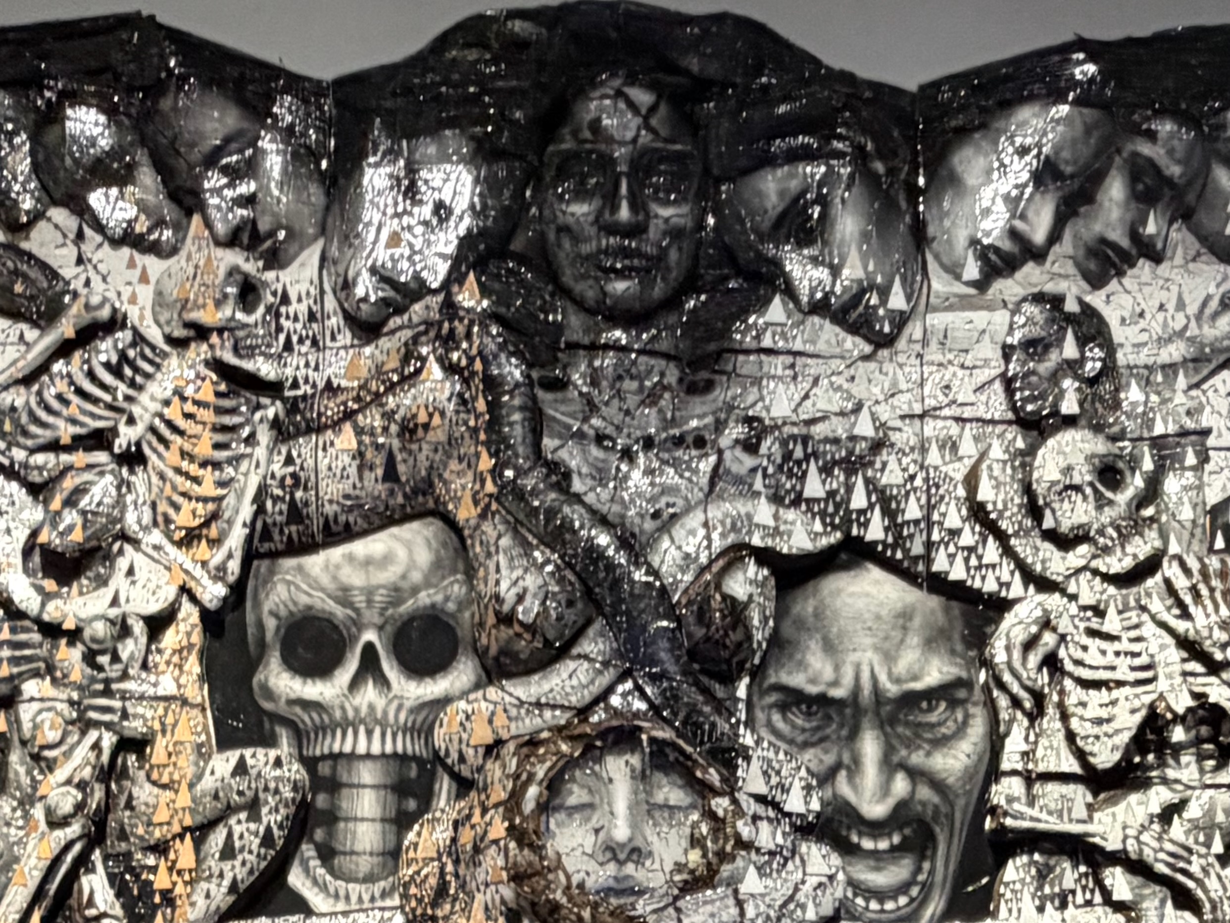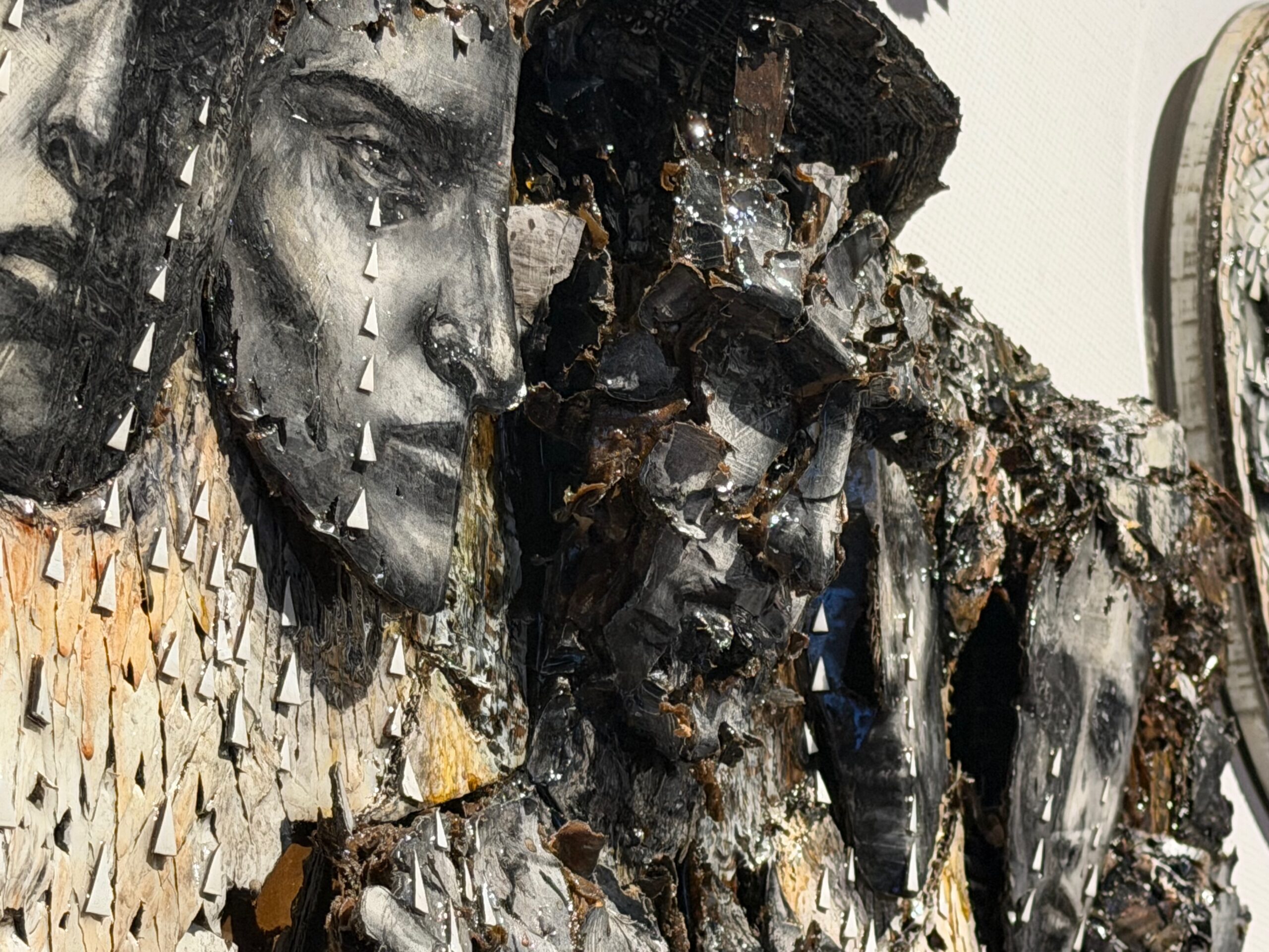 《死と再生のイニシエーション》が鑑賞者を圧倒するのは、さまざまな要素が挙げられるが、その一つは独自技法だろう。破損したダンボールの表面、浮き上がるように存在を示す神話的存在、精密に重ねられた三角形、樹脂の輝きをまとった作品群は、プロセスそのものが作家の生きざまを伝えるものとなった。