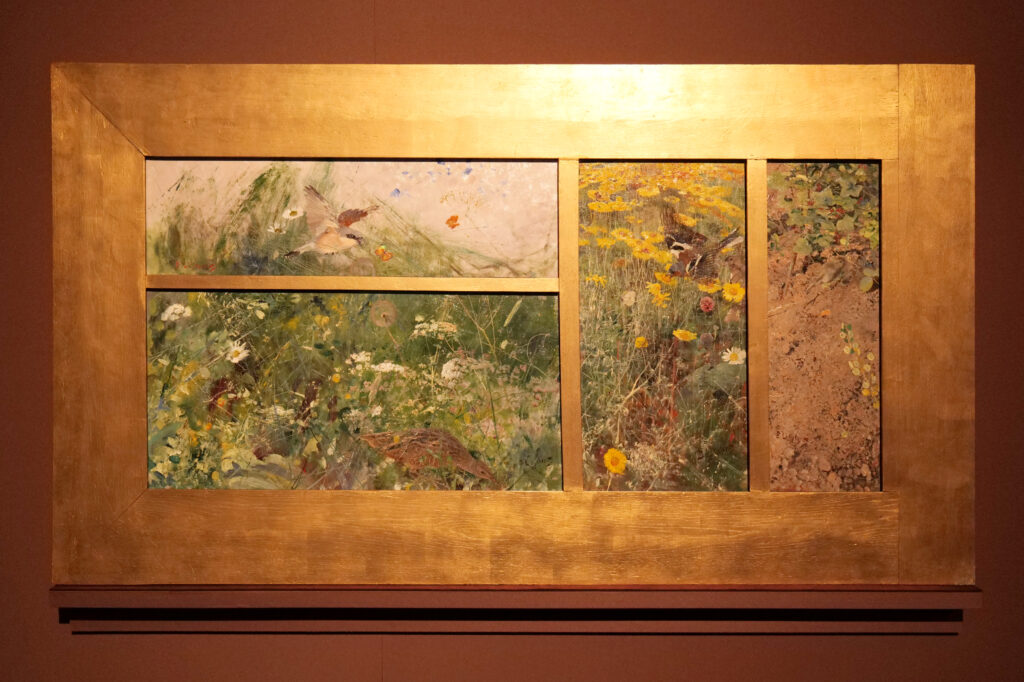 《4種の鳥の習作》の趣向を凝らした額縁は、リリエフォッシュ自らがデザインしたもの。日本の襖絵、屏風絵で用いられる「貼交(はりまぜ)」が意識されているという。鳥と草木の組み合わせは日本画も思わせる。草木の中で活動する鳥たちをとらえた一コマがリズム良く配され、鑑賞の悦びに満ちた作品となっている。