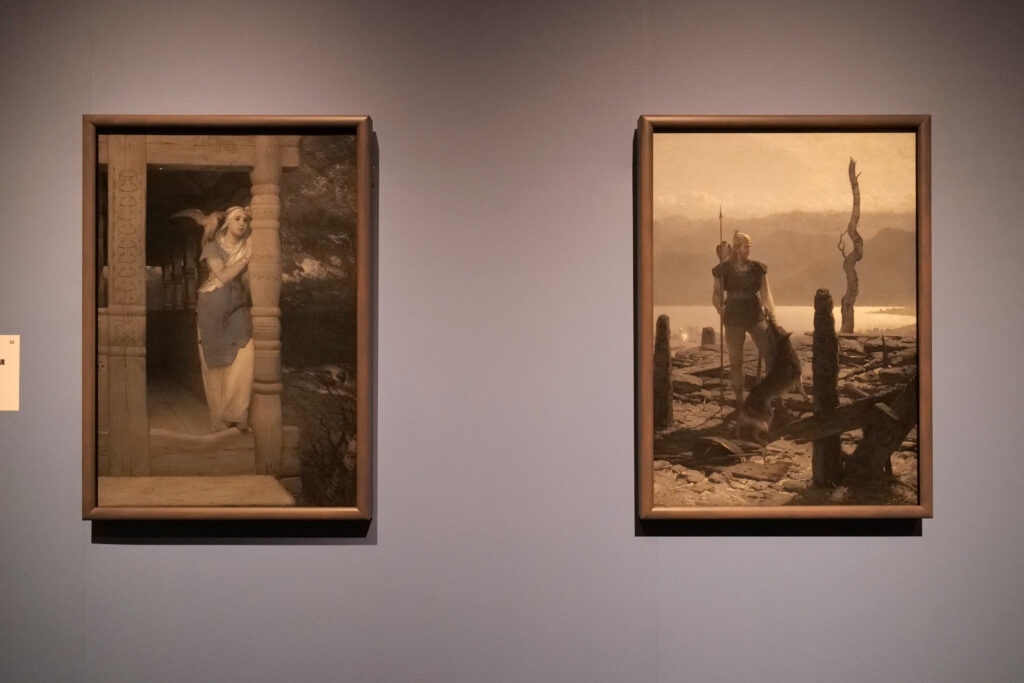 『フリッティオフ物語』は、姫インゲボリと幼馴染のフリッティオフが結婚を望むが、身分の差により引き裂かれ、フリッティオフは島に追放されるなど多くの困難を乗り越えながら、勇敢な戦士へと成長し、インゲボリとの結婚を果たす物語。島へと追放されていくフリッティオフの身を案じ、柱に手を添え遠くを見つめるインゲボリ。肩には共にかわいがった鷹が乗り、手首にはフリッティオフと交換した腕輪が輝く。右側の作品は、帰還したフリッティオフが、姫の兄と弟の王子たちにより自身の館が焼かれていたことを知る場面である。