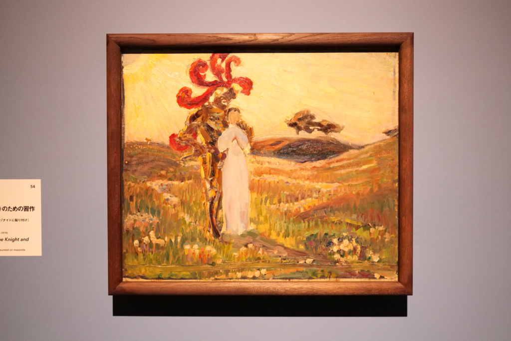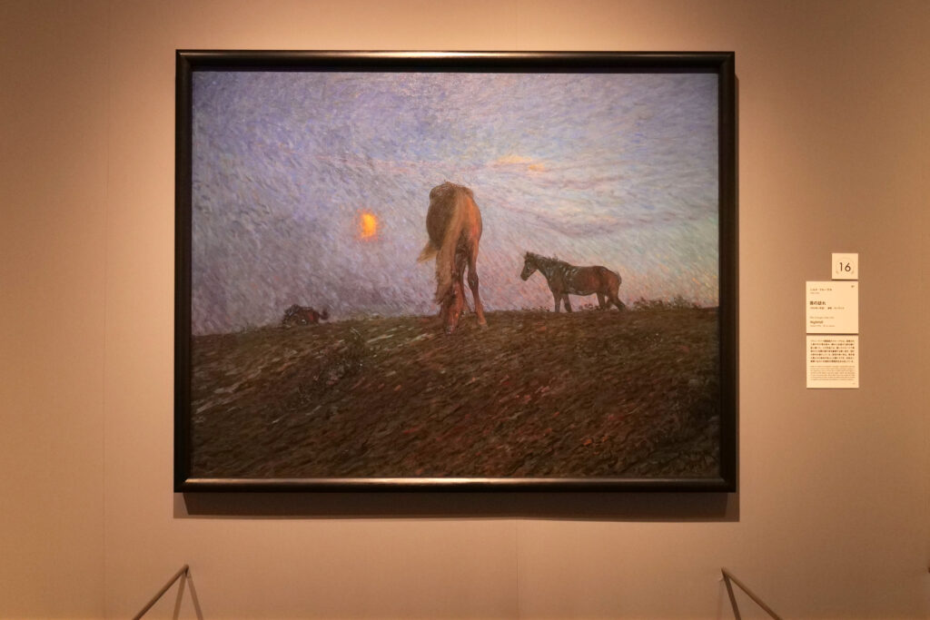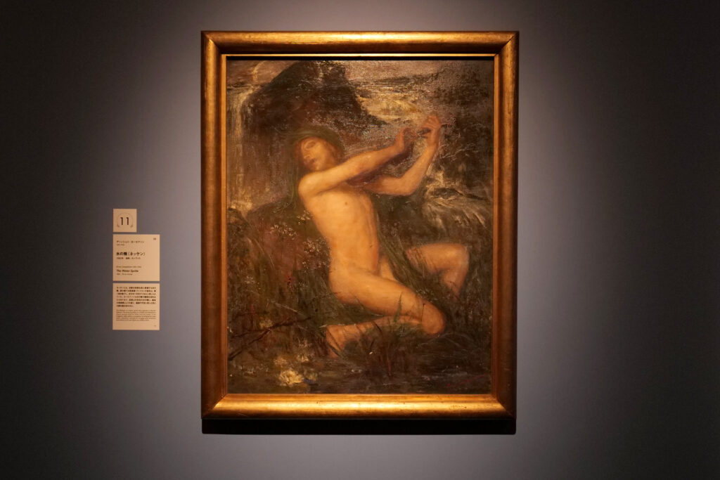来場者を初めに出迎えてくれる本作。手をつなぎ円になり、やわらかく舞う妖精たち。穏やかな陽の光を受け、祝祭をしているのか。しなやかな腕は凪いだ波のように流線を描く。肌を照らす、夕日の朱色が優しい。見つめているだけで、絵画の時空に溶け入るような感覚がもたらされる。