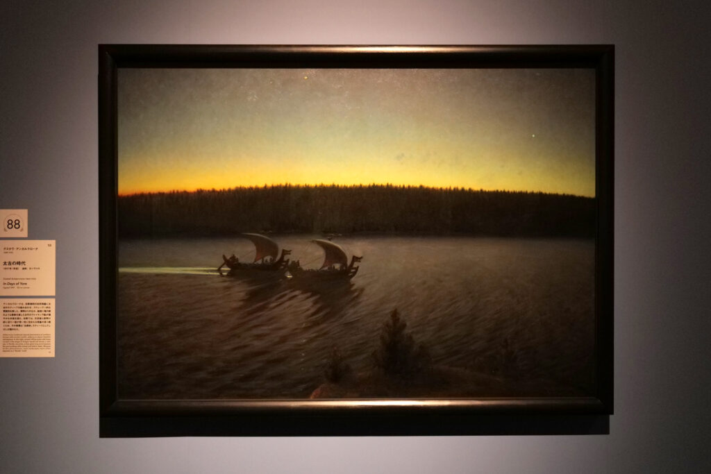スウェーデンの民俗的な主題に関心を寄せていたグスタヴ・アンカルクローナによる本作は、スロールッキングの入り口として提案されている作品の一つだ。2隻のヴァイキング船が、薄明かりの中、静かな川を進んでいく。白夜のスウェーデン、時間帯はいつ頃か、船はどこへ向かうのか、誰が乗っているのか、さまざまなことに思い馳せながら鑑賞したい。