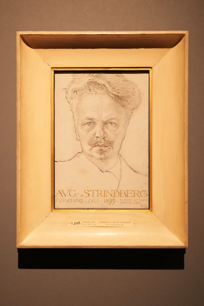 ストリンドバリはカール・ラーションと深い交友を結んだ。ラーションは1870年代にストリンドバリに出会って以来、10年にわたり彼の著書に挿絵を描いてきた。本作はラーションがストリンドバリを描いたものだ。ストリンドバリの険しい表情とは対照的に、木炭で描かれたラーションの優しい筆致が印象深い。瞳や唇へ淡い色が足されており、やわらかく、親密な空気をかもしている。