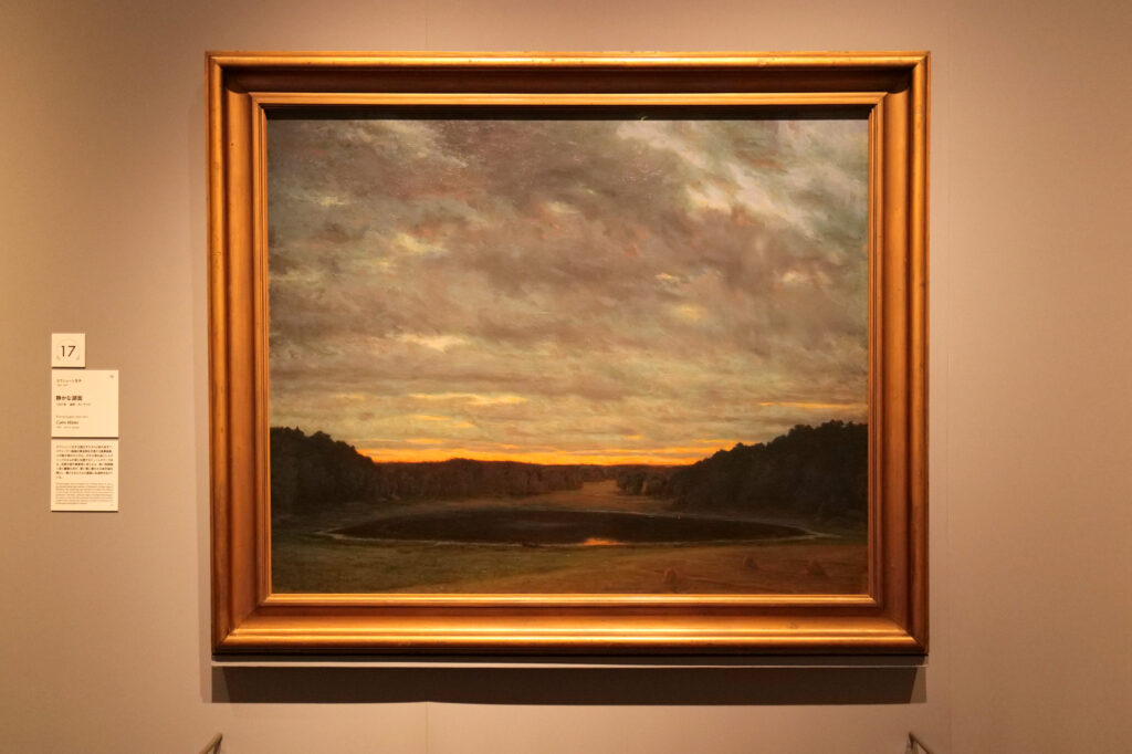 当時の国王オスカル2世の末子のエウシェーン王子は、芸術の才を高く発揮した。夏はストックホルム南部のティーレスウーの宮殿に滞在し、絵画制作に打ち込んだという。ティーレスウーで描かれた本作は、夏のスウェーデンで見られる黄昏時の陽の光が繊細な輝きをもたらしている。遠くにじむ陽光が、たっぷりと浮かぶ雲を繊細に染め上げている。水面は、陽光に呼応するようにほのかな輝きを見せる。静寂と光が見る者を包む。