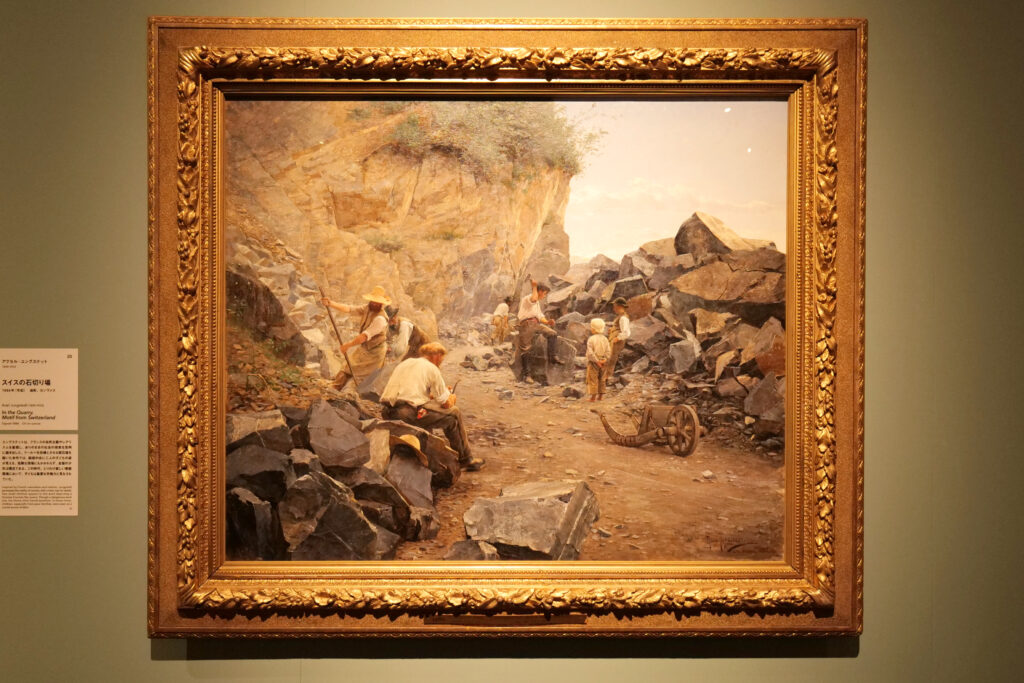 人々の労働の姿が飾り気なく描かれた作品も多い。石切り場で働く労働者たちの背中は不動の佇まいを見せている。背景に大きく描かれる、そそり立つ岩肌、その上部で生い茂る緑が余韻を残すように空に浮かぶ。左下に堆積する石から右上に広がる空に向かい、気が通り抜けていくような構図も見事だ。