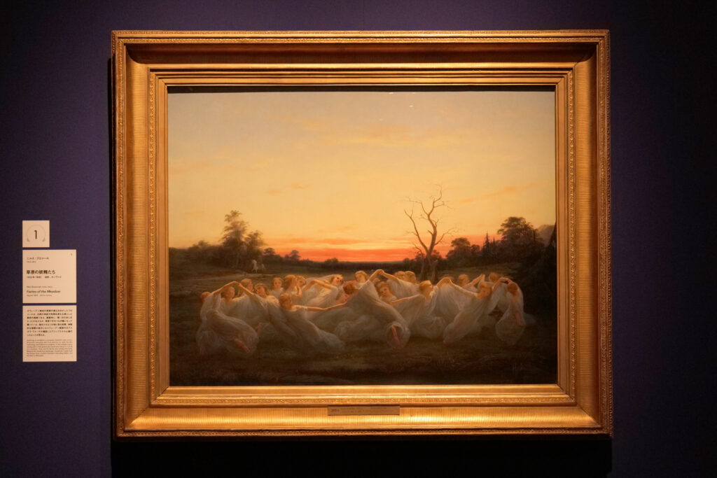ニルス・ブロメールは、スウェーデン王立美術アカデミーで学んだのち、ドレスデンを経由してパリに留学する。スェーデン独自の芸術の確立を目指し、北欧の神話や民間伝承を題材に取り入れた。妖精たちの背景には、馬に乗る人物や、遠くにスウェーデン国王が建立したグリップスホルム城の影が見える。スウェーデンの黄昏時を彩る光景を、細部まで味わいたい。