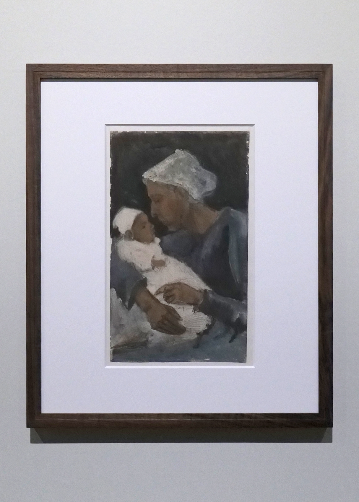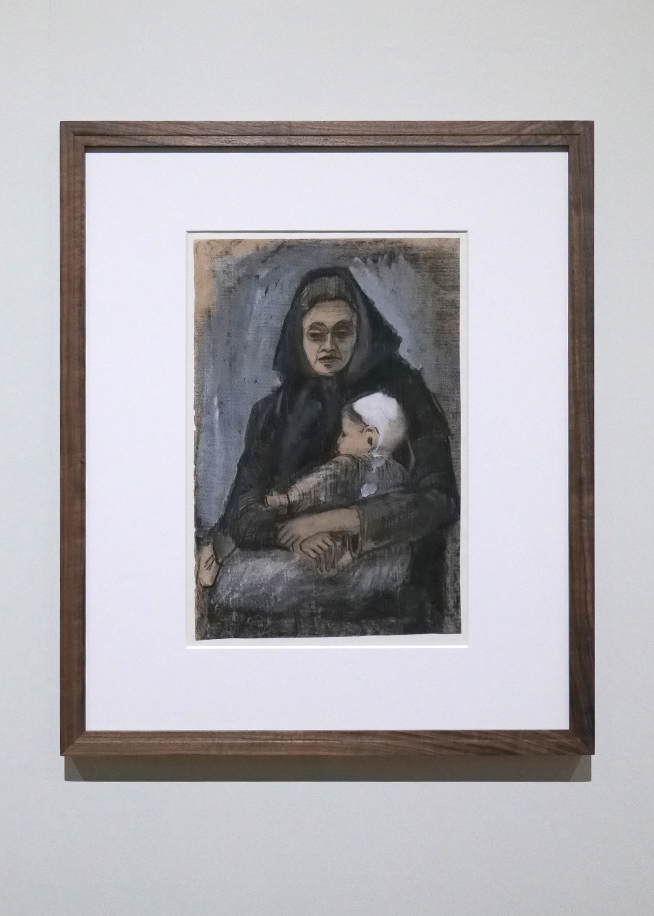 ゴッホは37年という生涯で時に激情を燃やし、幾人かの女性に焦がれ、求愛したが、それが実ることはほぼなかった。ただしハーグ在住時に、娼婦で、妊娠中であったシーンと出会い、一時期において家族のような暮らしを送っている。本作は、シーンが息子ウィレムを抱えた姿が描かれている。シーンは、ゴッホ初期のドローイングの名作《悲しみ》のモデルとなった女性だ。子供を抱きこちらを見据える女性。暗い色調、黒い衣服、顔に刻まれたシワ、血色のない肌、そこには美を引き立てる意図は見られず、対象に迫るような深い筆触が残る。息子の帽子が放つ白が対照的だ。