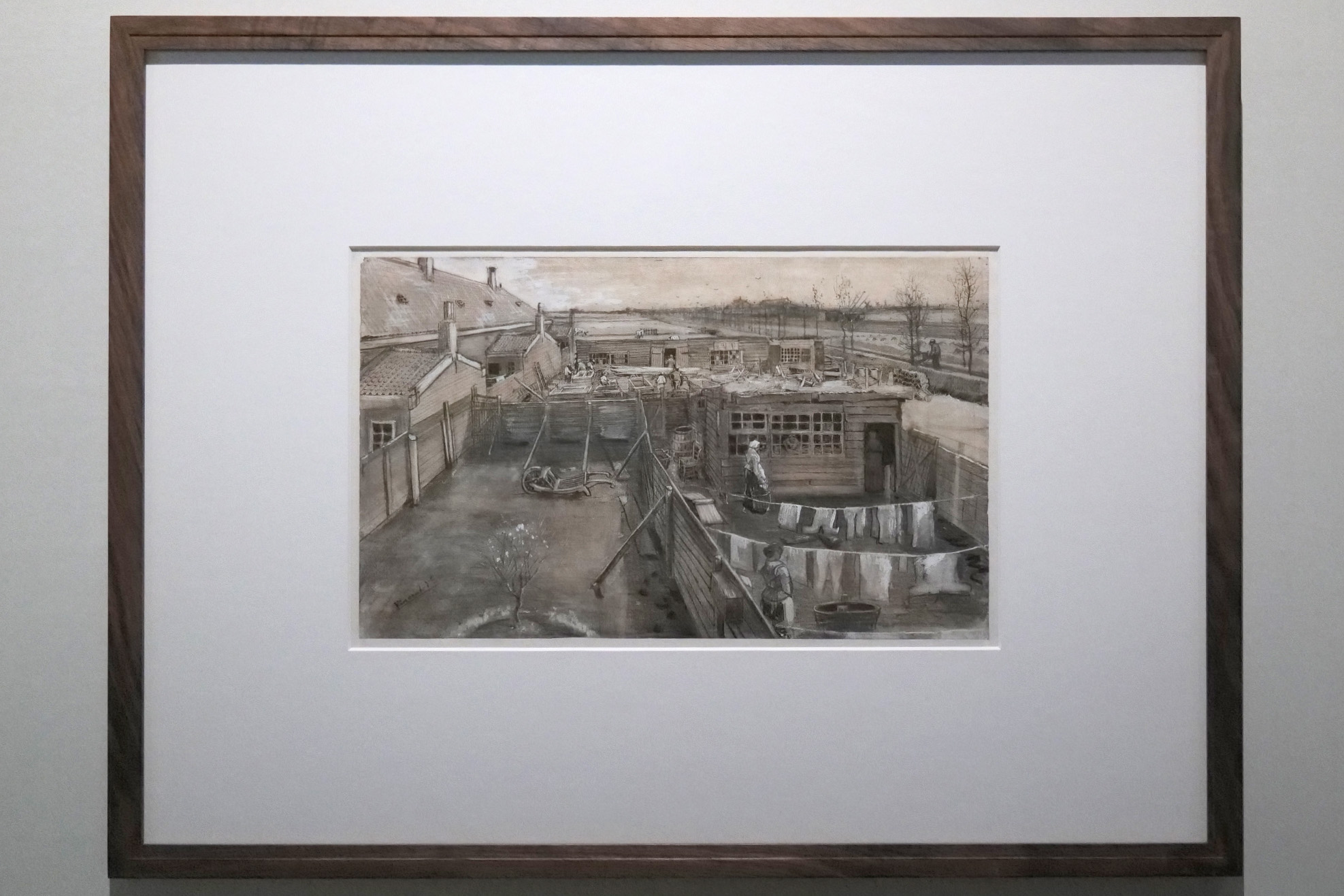 本作は、叔父からハーグの風景画の制作注文を受けて描いた作品の1点だ。奥行きのある構図で、ハーグの街並み、そこでの生活が垣間見える。ハイライトのように際立つ白が、人や事物の存在を浮き立たせている。思考の跡が感じられる構図に、遠近法の表現が見られ、ゴッホが習得した絵画技法を積極的に実践していることが読み取れる。ゴッホは本作を叔父からの注文で制作した。テオ宛の手紙に、本作をおそらく叔父が気に入らないであろうことに言及しつつ、「遠近法とプロポーションとの練習となった」と記している。