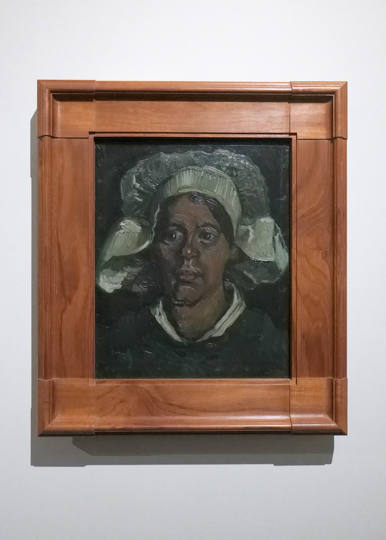 1883年冬、ゴッホは両親が住むニューネンに移り住む。この頃、ゴッホは頭部を見据えた作品も多く制作している。こちらの作品は、ニューネンで働く女性を描いた作品。ニューネンのガーゼの白い帽子は、ゴッホの関心を引いた。大きな白い帽子が、暗闇の中でほのかな光を見せる。闇に染められた人物の肌、衣服、白い帽子が薄暗い色を発し、プリーツや布の膨らみの陰影が巧妙に描かれている。