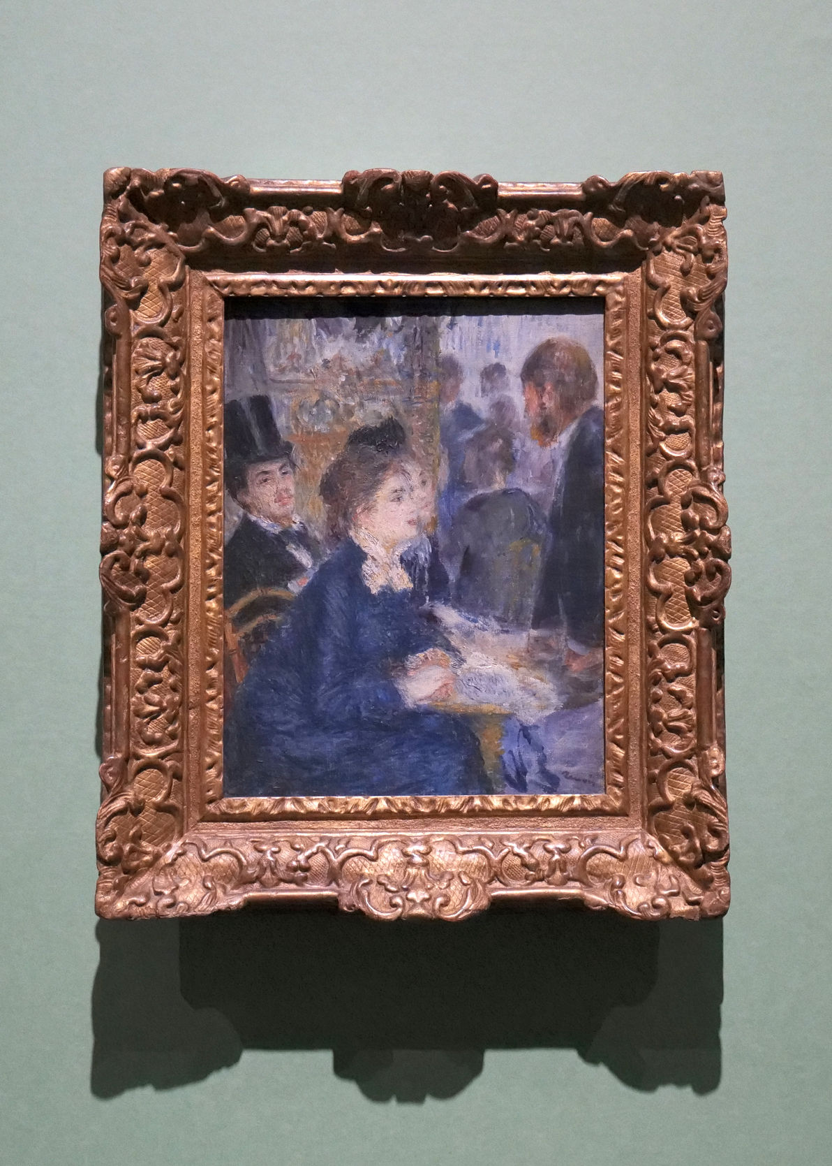 カフェで機嫌良く何かに見入る女性たち。後ろのハットを被った紳士や通りがかりの男性が彼女たちに視線を注いでいる。輪郭線がない軽やかな筆触で個々の意気揚々とした瞬間が押さえられ、カフェの活況を伝える。