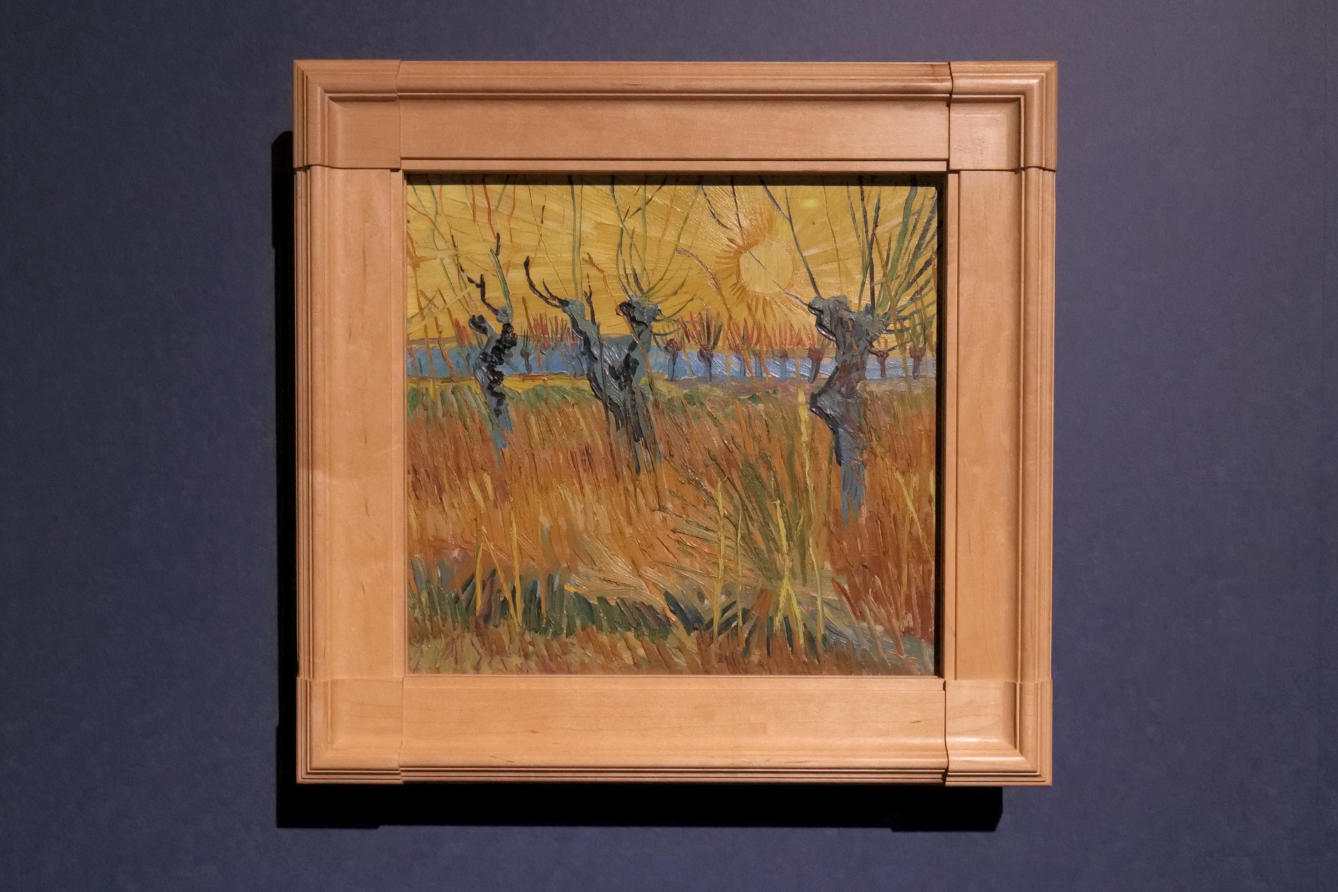 黄色、オレンジ、青、緑など鮮やかな色彩で夕日と柳をとらえた本作は、ゴッホがアルルに移り住んだ初期、1888年3月頃に制作されたと考えられている。夕日が一面を染め上げ、太陽の輝きに呼応するように、草木に光の筋が見られる。画家は再び自然に向かい、空を見上げ、太陽や星の輝きを画面に描き出す。