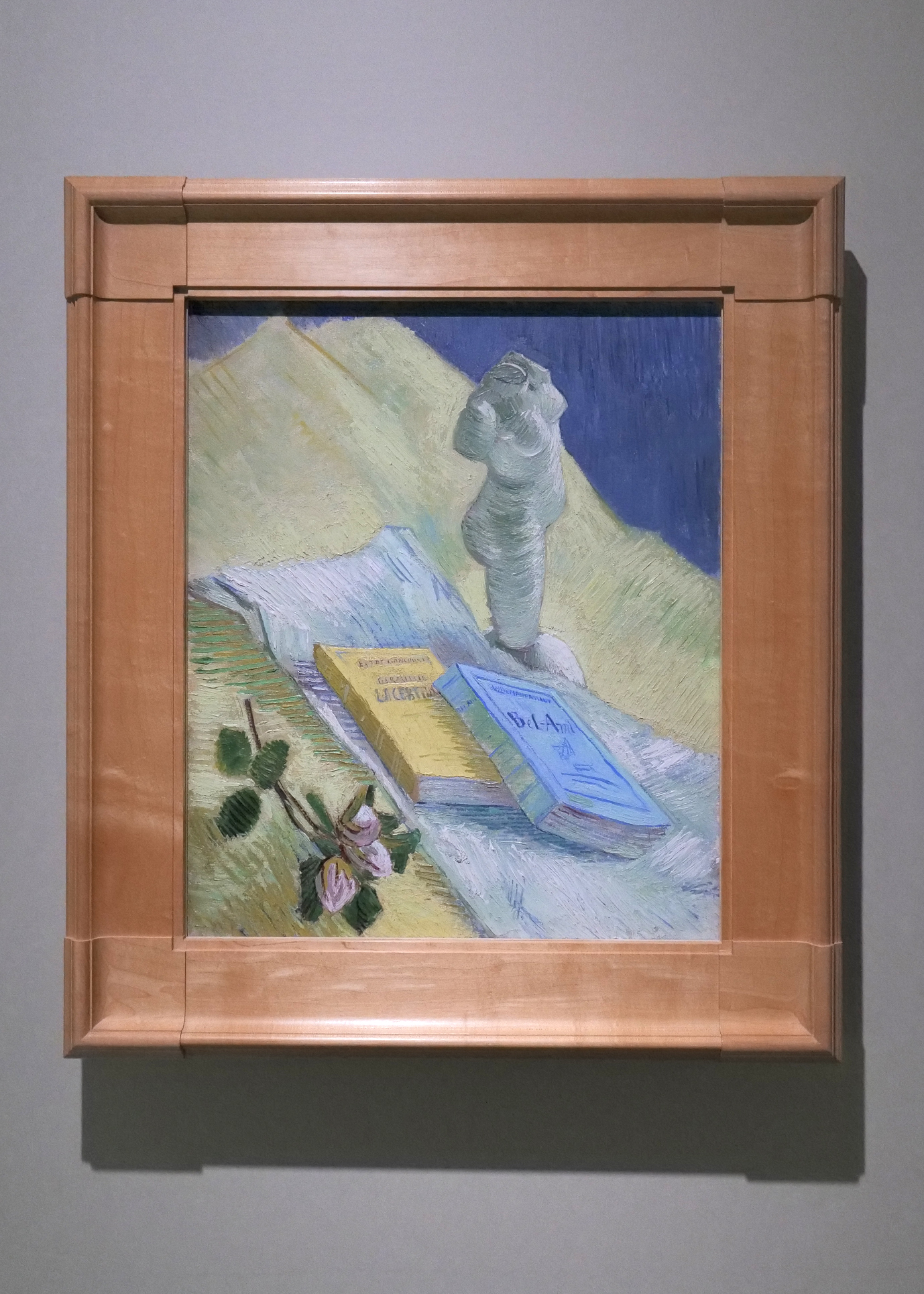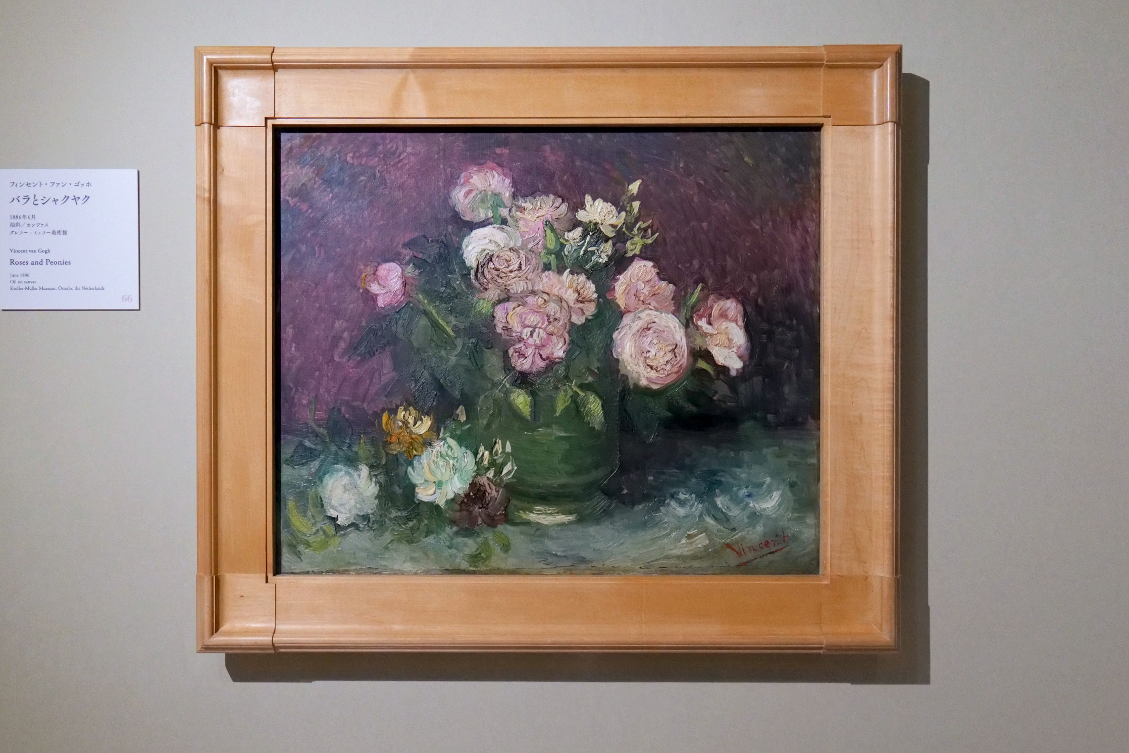 ゴッホは花を描き始める。本当は人物画を描きたかったが、モデル代を確保できず、花を描いて色彩を研究した。赤と緑、黄色と紫、など対比となる色の極端な対比を避けるために試行錯誤したことが当時の手紙に残されている。中間色として万能な灰色でなく、「強烈な色彩を描き出そうとしている」と。一年後に描かれた花の静物画はより軽快な筆使いで、明るい作品に仕上がっており、ゴッホの新境地を見ることができる。