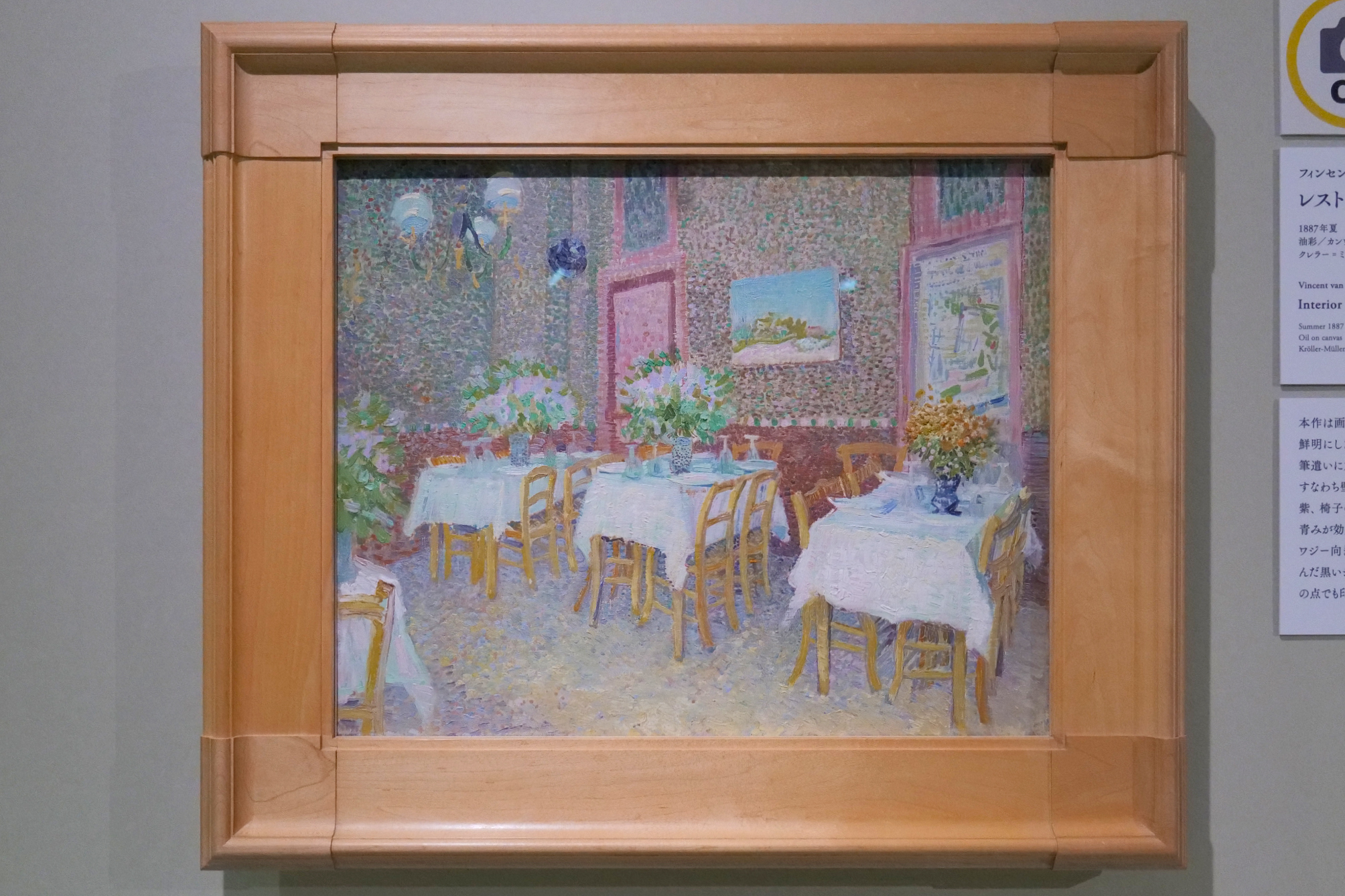 ジョルジュ・スーラを思わせる点描が際立つ本作。やわらかなピンクが散らされ、温かで、洒脱なカフェの空間が生み出されている。けれども、その筆触は均一ではなく、あちこちに筆の強弱が見られる。そうした点に、ゴッホがオランダで積み重ねてきた表現、土着的な、均一な力で抑えきれない生命力のみなぎりを感じ取ることができる。