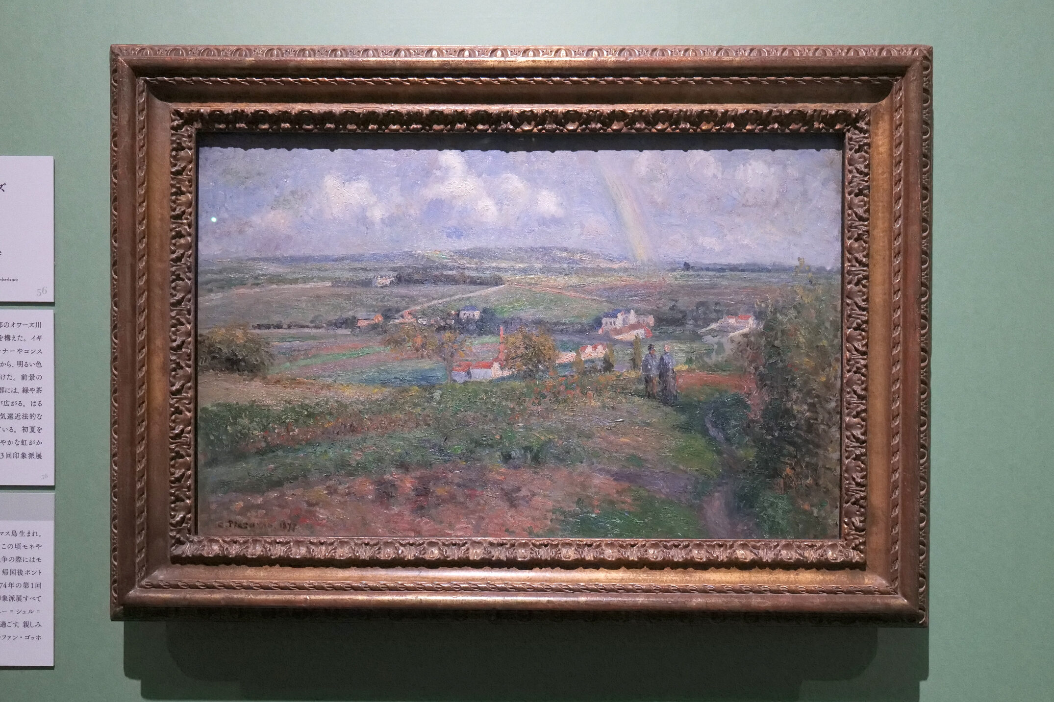 印象派の創始者の一人であるカミーユ・ピサロ(1830〜1903)は、初回からすべての印象派展に作品を出展した。本作は1877年の3回目の印象派展に出品したもので、パリ近郊のポントワーズで描かれた。前方から中央にかけた田園風景は彩度が高く、遠くに臨む山並みが淡い色ににじむ。空気遠近法により、麓から立ち上がる一筋の虹に目を奪われる。スーラやシニャックたちとも交流し、点描技法を取り入れながら独自の表現技法を確立した。