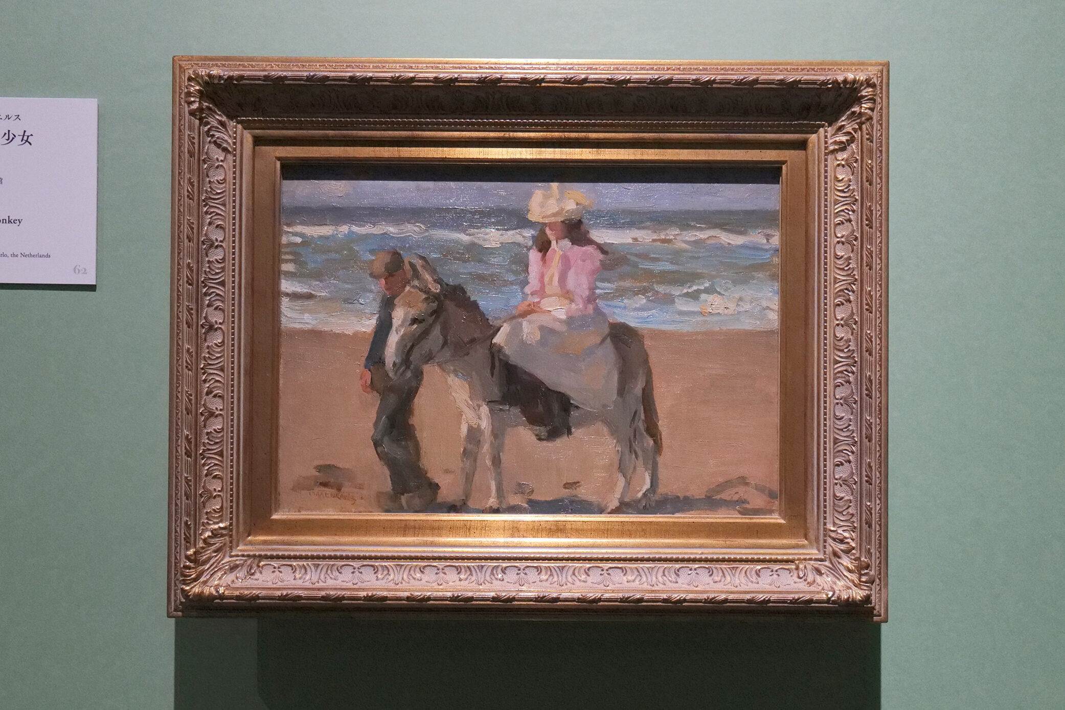 少女を乗せて海辺を行くロバ、それを引く男の姿がラフなタッチで描きとられている。ロバの体、少女の衣類の上に随所に添えられた白、背景の海と空の青を背景に鮮やかに浮かび上がる。軽やかな筆のタッチは、当時の瞬間、波の躍動を音とともに連れてきそうだ。ハーグ派の主導的存在であったヨーゼフ・イスラエルスの息子イサーク・イスラエルス(1865〜1934)は「描きすぎてはならない。長くても2時間までだ。あまりに長く描いていると、新鮮さが失われてしまう」という言葉を残している。
